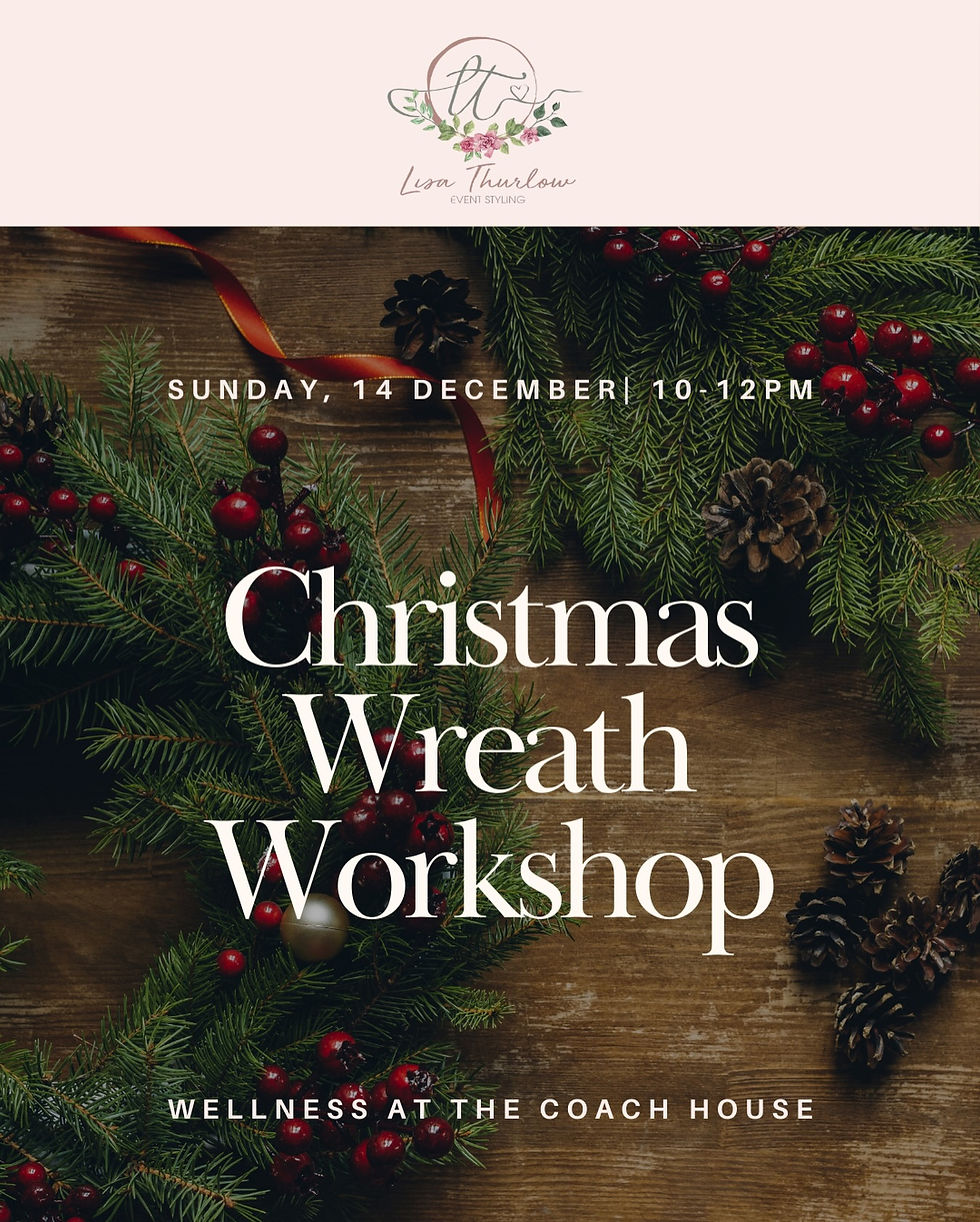 Join Wellness at the Coach House for a Christmas Wreath Workshop led by Florist Lisa Thurlow on Sunday 14th December, from 10am to 12pm ✨